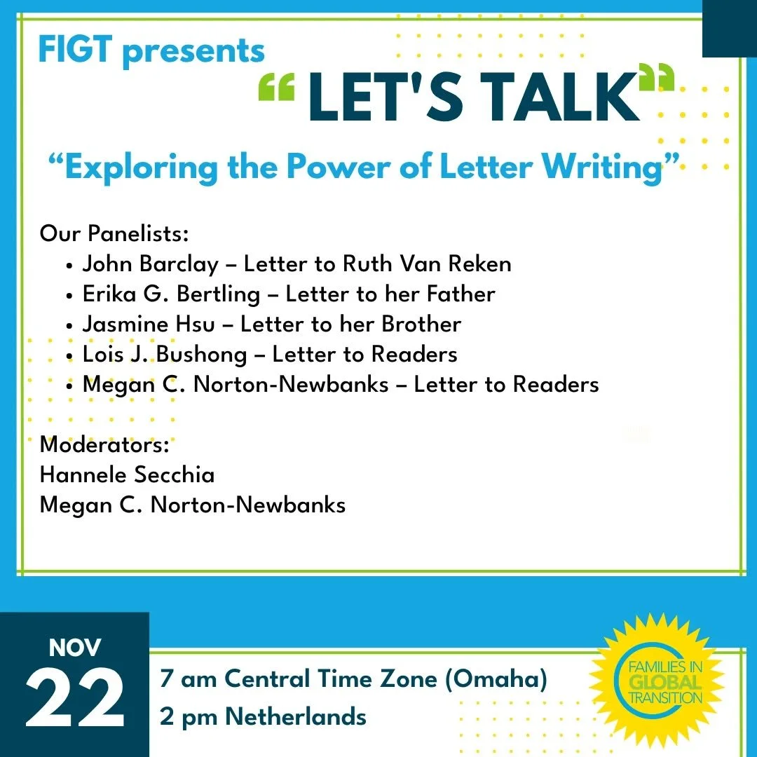 Join us for an engaging "Let's Talk" panel presentation and discussion featuring contributors to the new book Letters Now Sent: A Collection of Letters from the Globally Mobile. This thought-provoking session invites you into the personal, powerful world of letter writing across borders, cultures, and identities.
